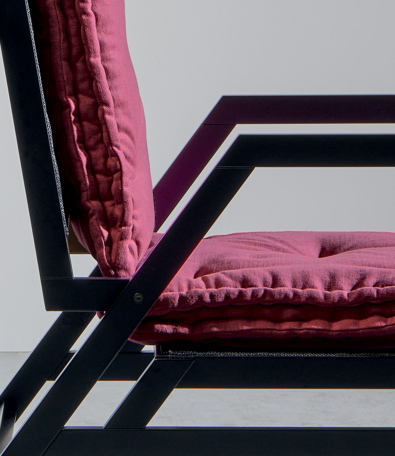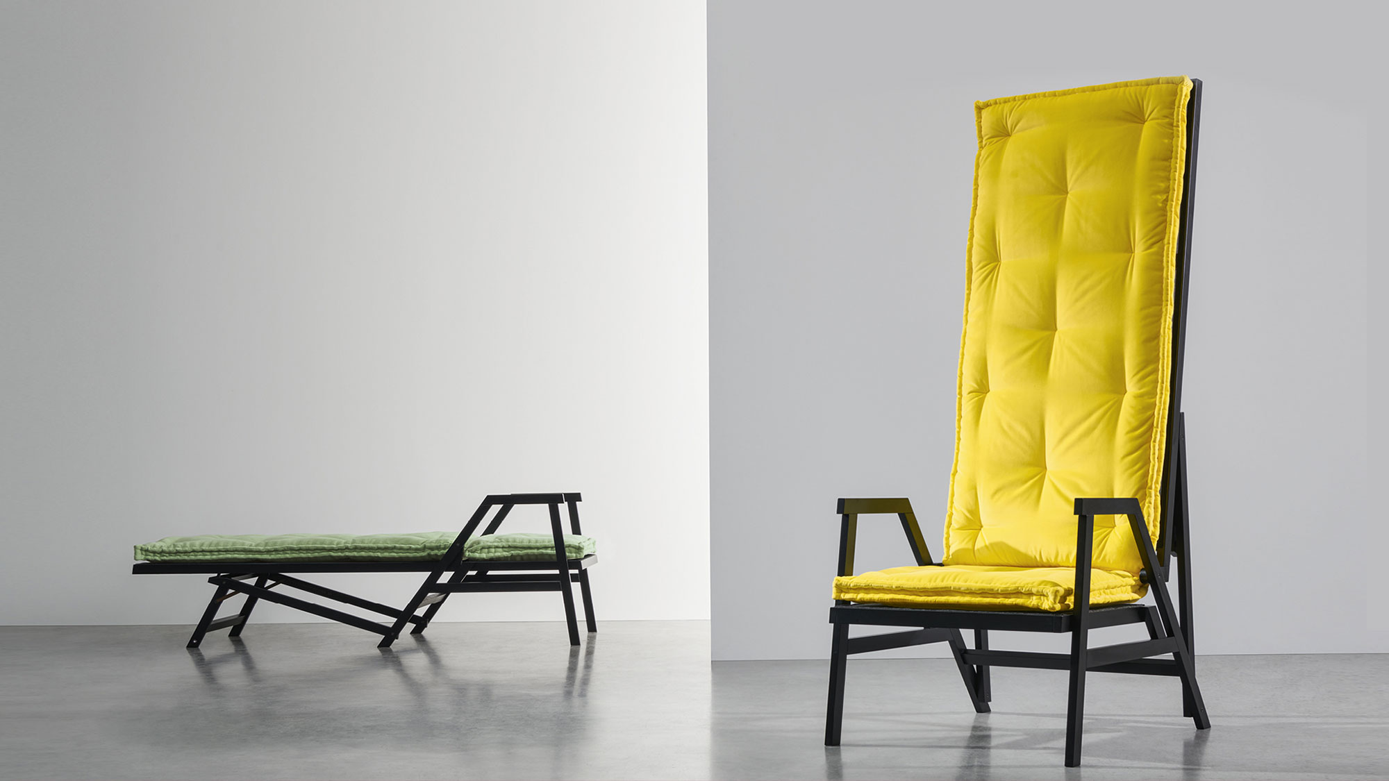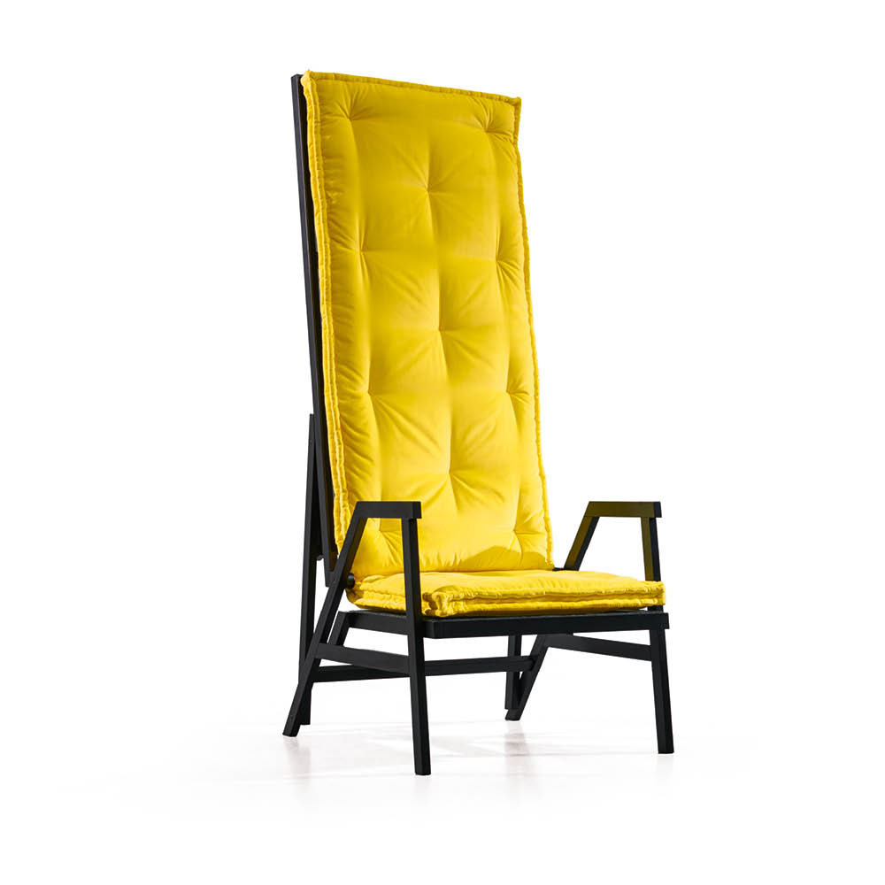 Образ шезлонга обогащён формальной элегантностью и превращается в многофункциональный предмет: отчасти кресло, отчасти кровать.