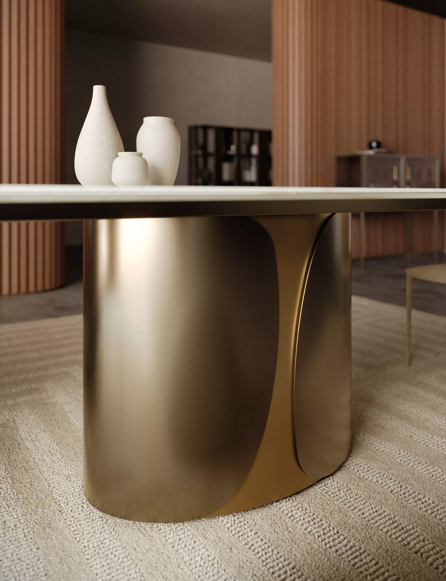 Талос-это стол, который навязывает себя в пространстве с твердой элегантностью и архитектурным присутствием. Отличительным элементом является монолитное эллиптическое основание, состоящее из двух симметричных оболочек, обнимающих центральное тело. Основа в металлическом варианте отличается изысканными цветовыми сочетаниями, которые вводят визуальные вибрации или изысканные эффекты ton sur ton. С другой стороны, при чередовании металла и дерева тепло эссенций сливается с блеском металлической отделки, создавая гармоничный баланс между материальностью и строгостью. В каждом варианте Талос сохраняет свою сценическую идентичность и главную роль, определяя пространство с харизмой.