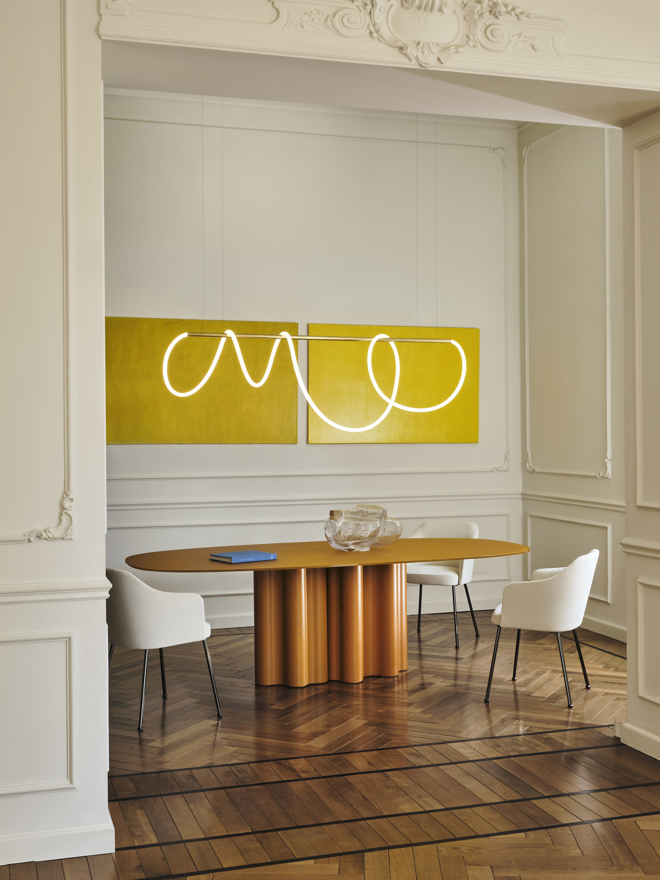 Новые столешницы для стола Teatro Magico используют сатинированное стекло в качестве материала, позволяющего «лепить» цвет света. Тёплый янтарь и мягкий кашемир — это два новых цвета, которые наряду с белым обогащают цветовую палитру Saba.