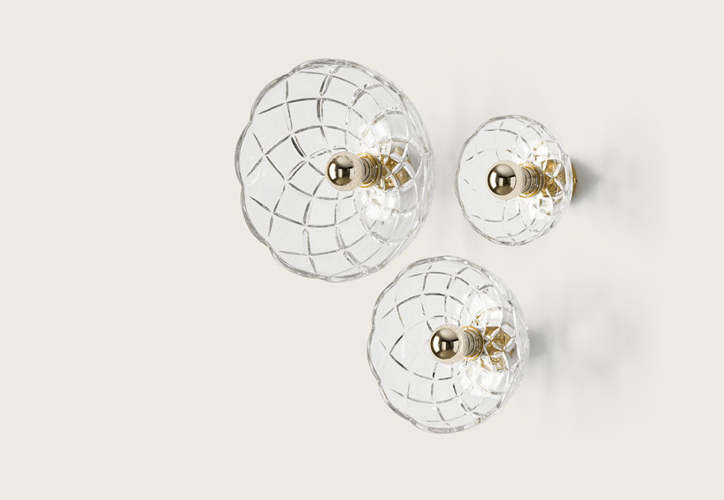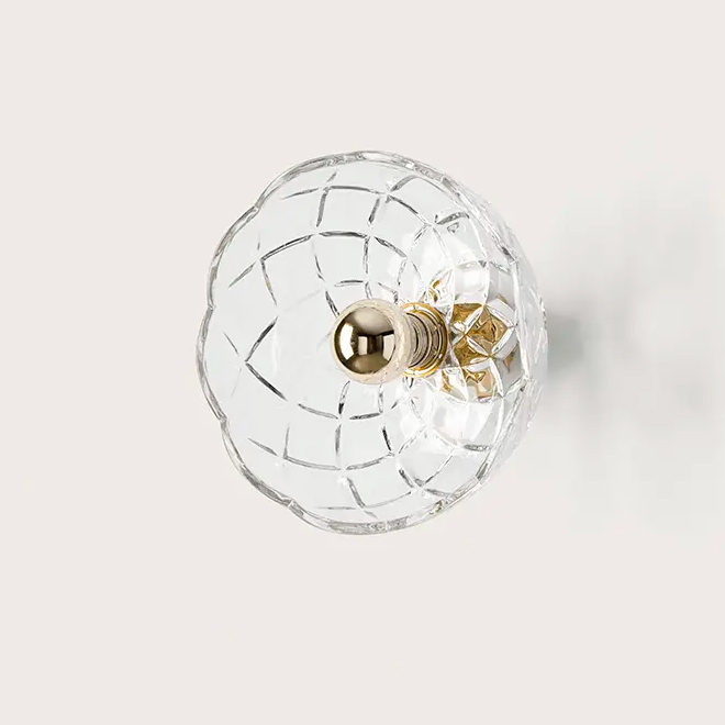 Настенный светильник из стали с прозрачным стеклянным плафоном. Доступен в двух премиальных отделках: блестящее золото или хром.
